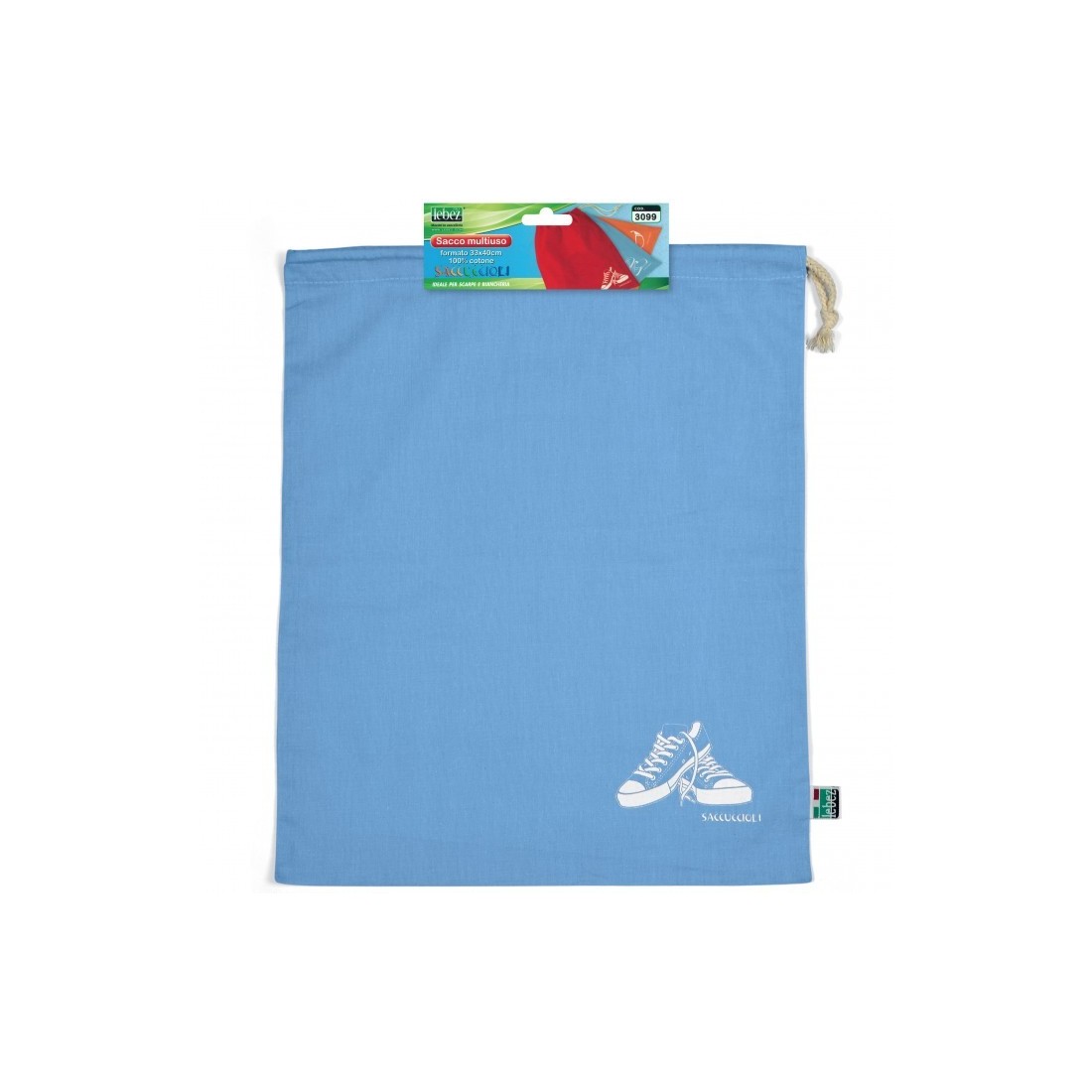Sacca Coulisse Multiuso Cotone Lebez, facilissima da usare con apertura a coulisse. Sacca perfetta da portare sempre con te per la scuola o nel tempo libero. Ideale per scarpe e biancheria