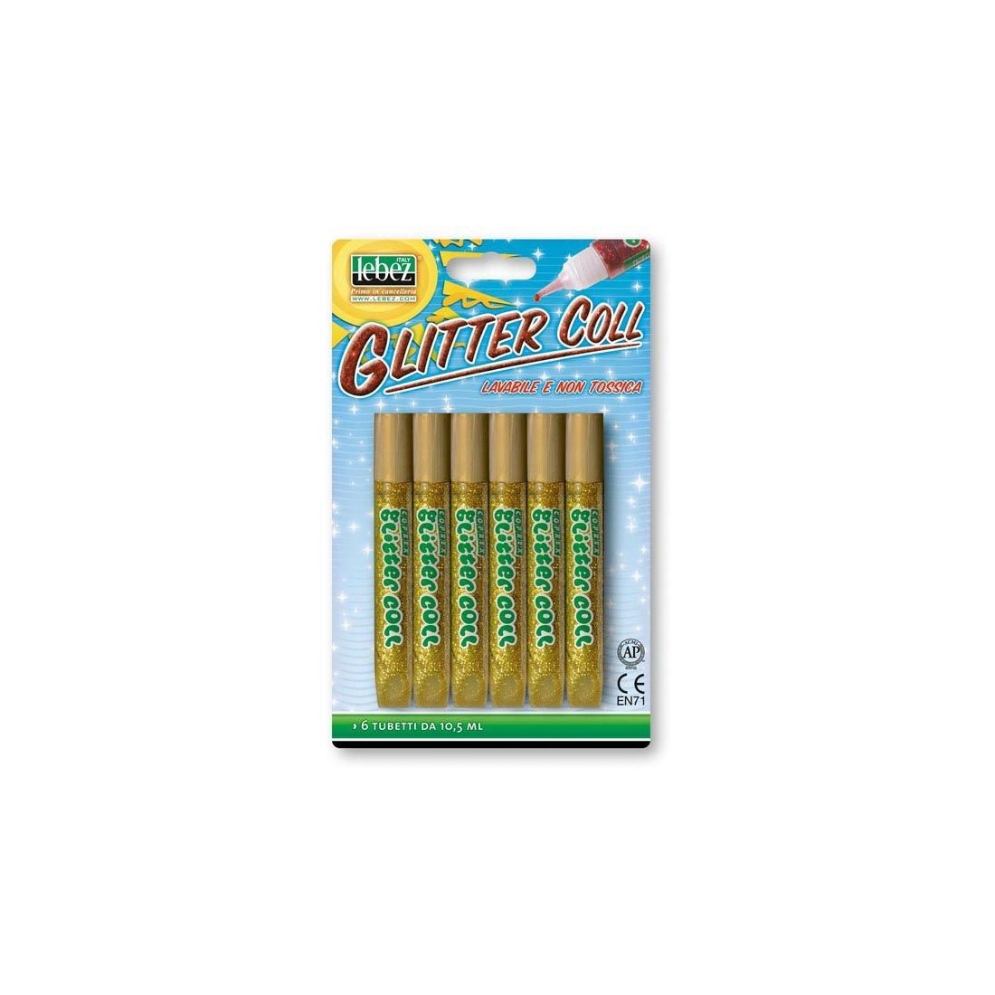 Colla Glitter della Lebez. Colla lavabile e non tossica. 6 tubetti da 10,5 ml nei diversi colori: verde fluo, azzurro, lilla, rosa fluo, arancio e giallo fluo. Ideale per decorare buste, fogli, quaderni e tutto ciò che uno desidera.