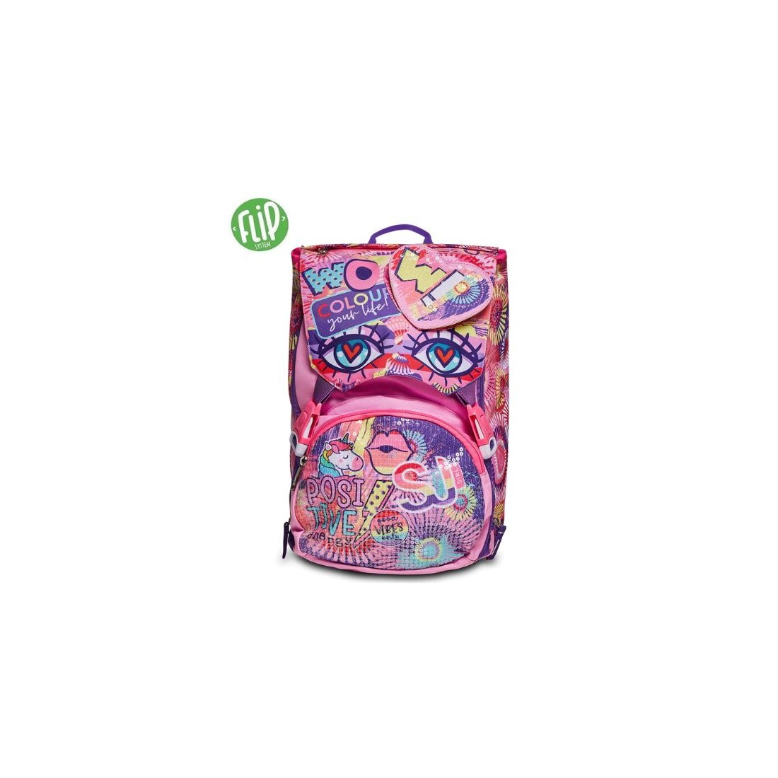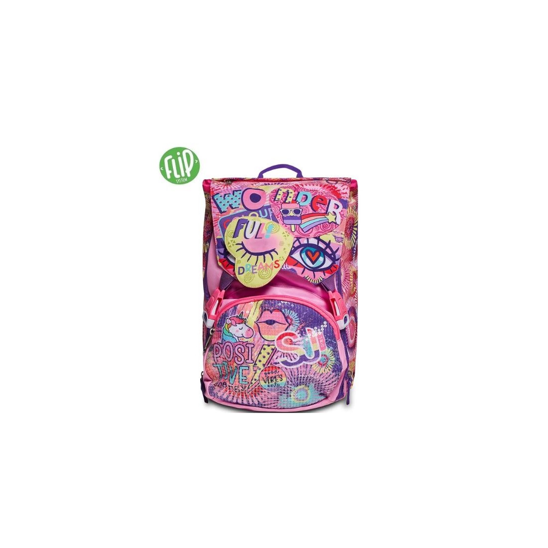 Ciao! Sono il nuovo zaino estensibile FACCE DA SJ GIRL! Grazie al mio FLIP SYSTEM, puoi divertirti a cambiarmi aspetto ogni volta che vuoi, sfogliando i mini flip con paillettes sulla pattina e creando combinazioni diverse! Ho un doppio scomparto spazioso, di cui puoi aumentare facilmente la capienza tramite le zip laterali per poter accogliere e distribuire in modo ottimale anche i carichi più pesanti. Sono dotato di una tasca frontale, ma soprattutto sono davvero comodo da indossare sulle spalle, grazie allo schienale Ergosystem preformato e agli spallacci imbottiti e traspiranti. In più, il fondo integrato mantiene la mia struttura inalterata, garantendo la stabilità del contenuto anche a pieno carico.