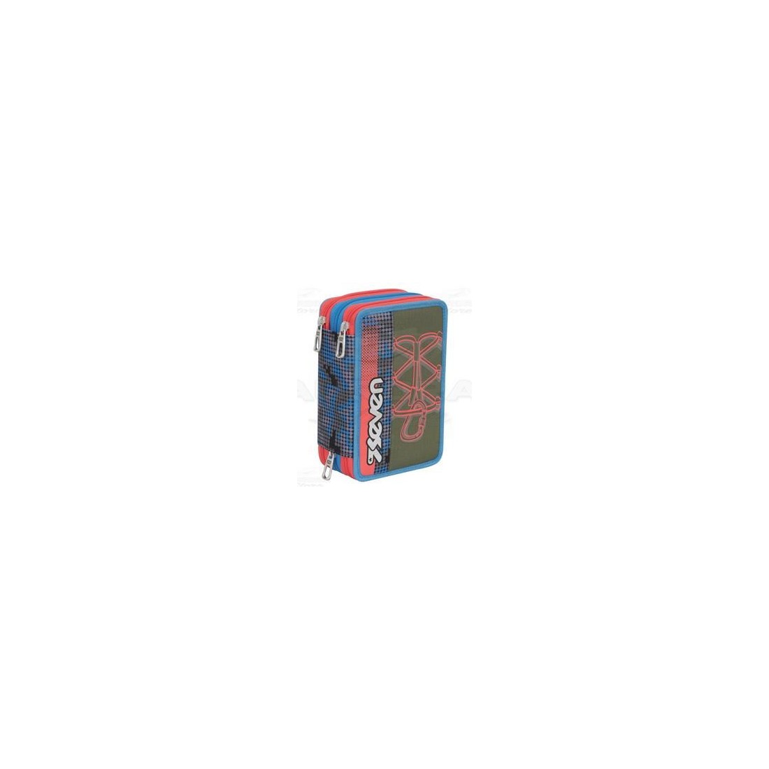 Astuccio accessoriato a ripiani con chiusura a 3 zip. Materiale all'interno: colla - gomma - temperino - matita - forbici - righello - penne - squadretta - pastelli Fila - pennarelli Giotto.