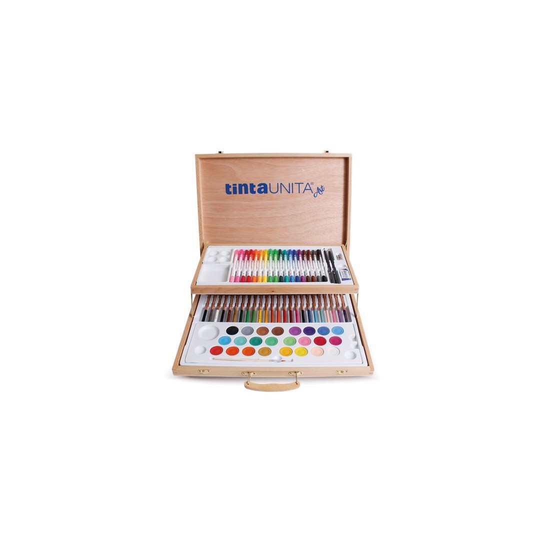 Queste esclusive valigette TintaUNITA Art includono matite colorate vivaci con Mina 4.0 mm, pennarelli brush vibranti e acquerelli di alta qualità, tutto racchiuso in un pratico e resistente astuccio in legno, o in versione cartoncino con maniglia.